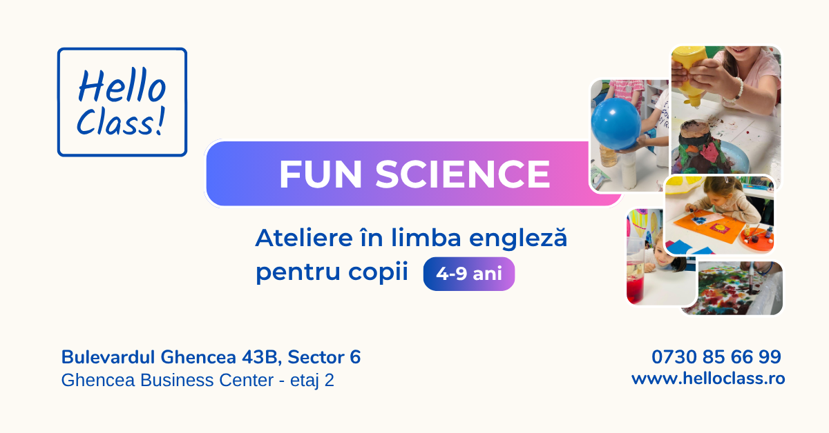 Explorăm știința prin magie și culoare: Lava Lamp, Volcano, Magic Milk, Floating Egg, Mixing Colours, Rain in a Glass, Rainbow Tissues.
